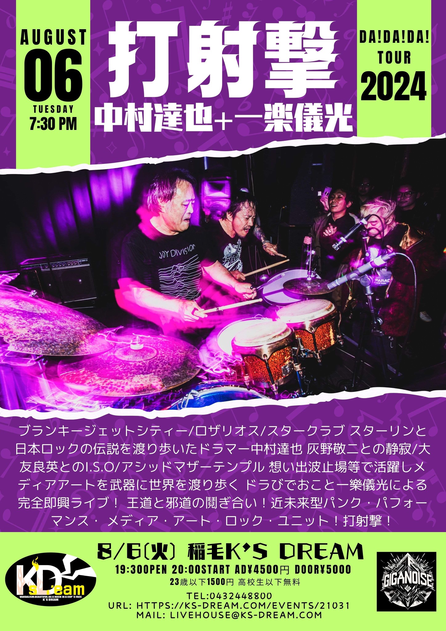 ブランキージェットシティー/ロザリオス/スタークラブ/スターリンと日本ロックの伝説を渡り歩いたドラマー「中村達也」と、灰野敬二との静寂、大友良英とのI.S.O、アシッドマザーテンプル等で活躍しメディアアートを武器に世界を渡り歩くドラびでおこと「一樂儀光」による完全即興ライブが遂に!予測不能の大爆裂DUO!